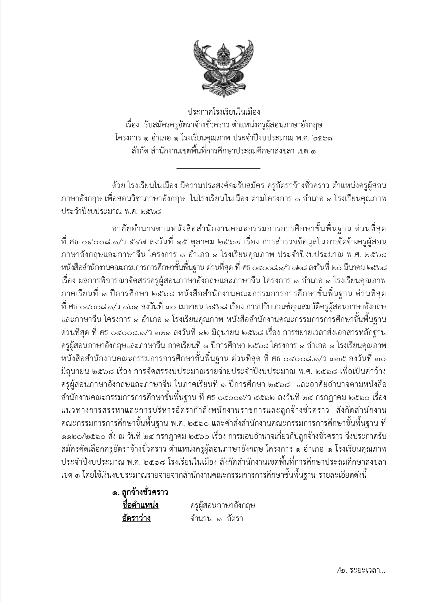ประกาศรับสมัครครูอัตราจ้าง ตำแหน่งครูภาษาอังกฤษ โรงเรียนในเมือง
